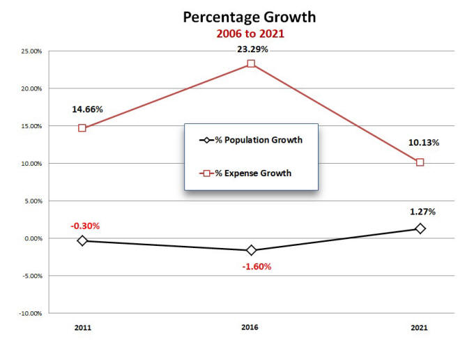 It is unreasonable to expect expenses to have been frozen at the 2006 level just because our population was shrinking As we all know, the cost of products and services go up a little every year. It is reasonable to expect our city to cap city expense growth at the same rate of inflation given that Owen Sound's population is relatively stagnant. Had this been the case from 2006 than Owen Sound taxpayers would have saved $10.9 million over the 20 years to 2026.