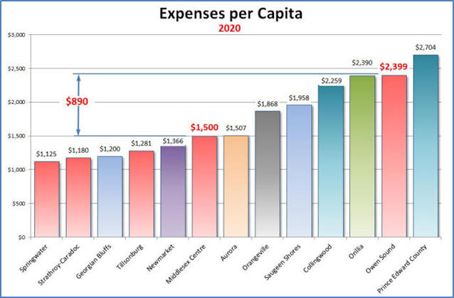 The chart above, shows total expenses per capita. When we look at our Primary Comparative Group, as shown with red lettering, we see that Owen Sound once again leads this group by significant margins. We see that Strathroy is quite a bit lower than Owen Sound in total expenses. However, Middlesex Centre is the closest this time with expenses per capita of $1,500 compared to Owen Sound at $2,399. Although it does look like much, the difference of $890 per resident is a huge sum. When you multiply this by Owen Sound 's population it works out to be a difference in expenses to run the city of $19 million. Middlesex does have a slightly smaller population so it could be that they do not provide the same level of services that Owen Sound provided its residents.