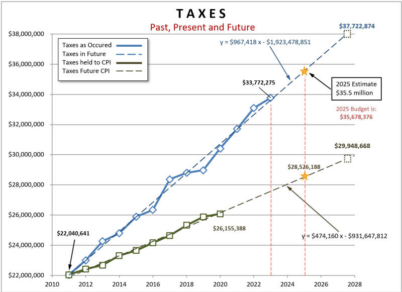 The revenue from taxation increased by $13.6 million, or 61.1%, between 2011 and 2025. For comparison the Consumer Price Index (CPI) increased $6.46 million or 29.3% during this same period. As shown below the increase in revenue from taxation was fairly linear during these years. This greatly increases the confidence in a linear projection of tax revenue into the future which is shown by the dashed trend lines. This linear projection shows that revenue from taxation has been increasing steadily at an average rate of $967,418 per year which is more than twice the rate of inflation. This graph relies on the city's audited Financial Statements which are highly reliable. Unfortunately, out city does not post these statements until nearly the end of the year following the year in question so the 2024 financial statements were not available as of October 2025.