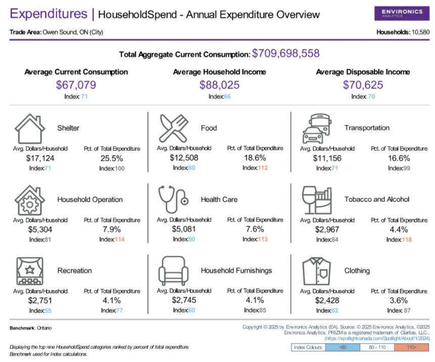Council commissioned another study in 2025, this one performed by Environics Analytics (EA). This study also compared Owen Sound to other municipalities, with a deeper dive into the “Livability” of its residents. Based on their methodology, they rank each aspect against an Index. Index Scores above 110 indicate a serious affordability issue.