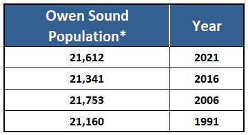 In the ongoing, financially questionable study entitled Vision 2050, the consultant highlighted in her report that only 25% of people surveyed would recommend Owen Sound as a city to move to. So we have stagnant population growth for over 25 years, rising property taxes and a very negative outlook for the city by its residents.