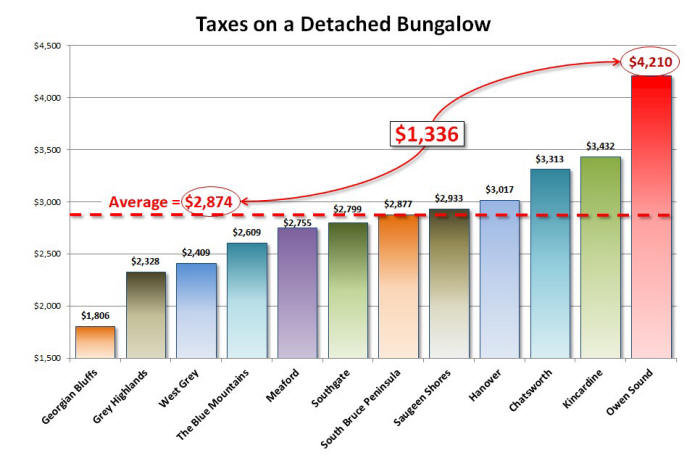 Now that we 've seen how Owen Sound taxes compare to similarly sized municipalities in the study group I thought it would be informative to look at how Owen Sound taxes compare with municipalities in Grey/Bruce Counties. Above in figure 3 we see the comparative taxes on a single detached bungalow. As could be predicted from the previous comparison Owen Sound is by far the highest taxed municipality in both Grey and Bruce Counties. The difference is alarming. At $4,210 Owen Sound taxes are $1,336 above the average in Grey/Bruce. What 's even more alarming is that Owen Sound taxes are $2,404 higher than our neighbours in Georgian Bluffs. Is it any wonder why people are moving just next door to Georgian Bluffs? You can save $200 per month on your property taxes just by moving a couple of blocks and still be able to enjoy everything Owen Sound has to offer.