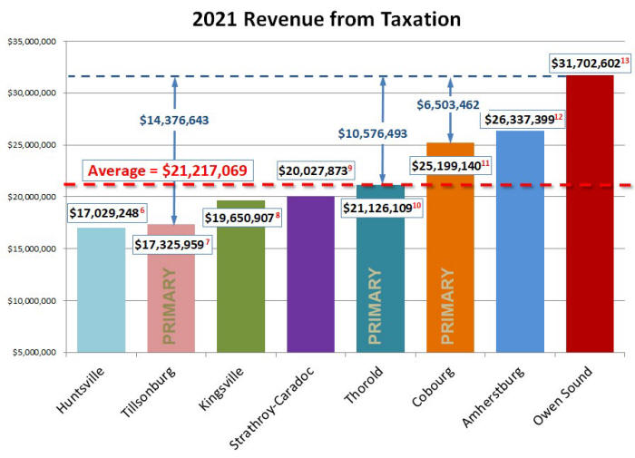 As shown above, Owen Sound 's revenue from taxation is significantly greater than that of the comparator municipalities. The average of the three Primary Comparators is $21.2 million which is $10.5 million less than Owen Sound 's.