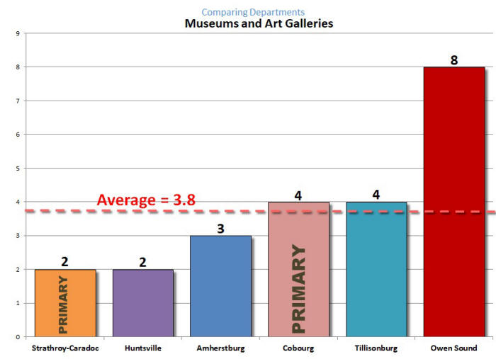 The most alarming example of overstaffing however, is the staffing of the Art Gallery shown below in figure 22 which has twice the workforce as the average of the primary comparator municipalities. It 's noteworthy that the Owen Sound Org Chart at Annex E43 shows 8 staff working at the Gallery. Yet, the 2023 Budget Book 49 shows only six employees working at the Art Gallery.