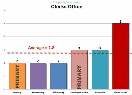 There are discrepancies between Organization Charts that Owen Sound provided for this study and the 2021 Financial Information Report which makes it difficult to identify all of the sources for the overstaffing shown in figure 20. However, figures 29 to 31 show a few examples. For example Owen Sound is the only municipality in the study group employing two Human Resources managers and the only municipality with an HR Team of 5 employees. Owen Sound is also the only municipality employing three managers in the clerk 's office – see Annex B. As well Owen Sound is the only municipality employing both a Director and a Manager of Corporate Services in addition to a Deputy Treasurer.