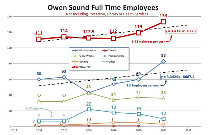 An interesting observation is that in the five years between 2016 and 2021 the total workforce, excluding Protective Services and Library, grew by 18 employees. This is a growth of 3.6 employees per year at a time when the population was relatively stagnant.
